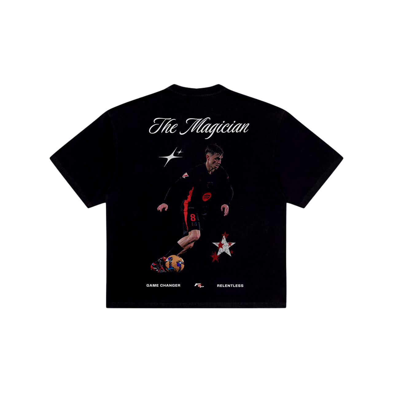 Black heavyweight cotton T-shirt with an oversized fit, perfect for wearing to the stadium or around town. The front features a print of Pedri from one of his best matches of the 24/25 season against Benfica in the Champions League, along with the Flair on the Pitch logo on the chest.